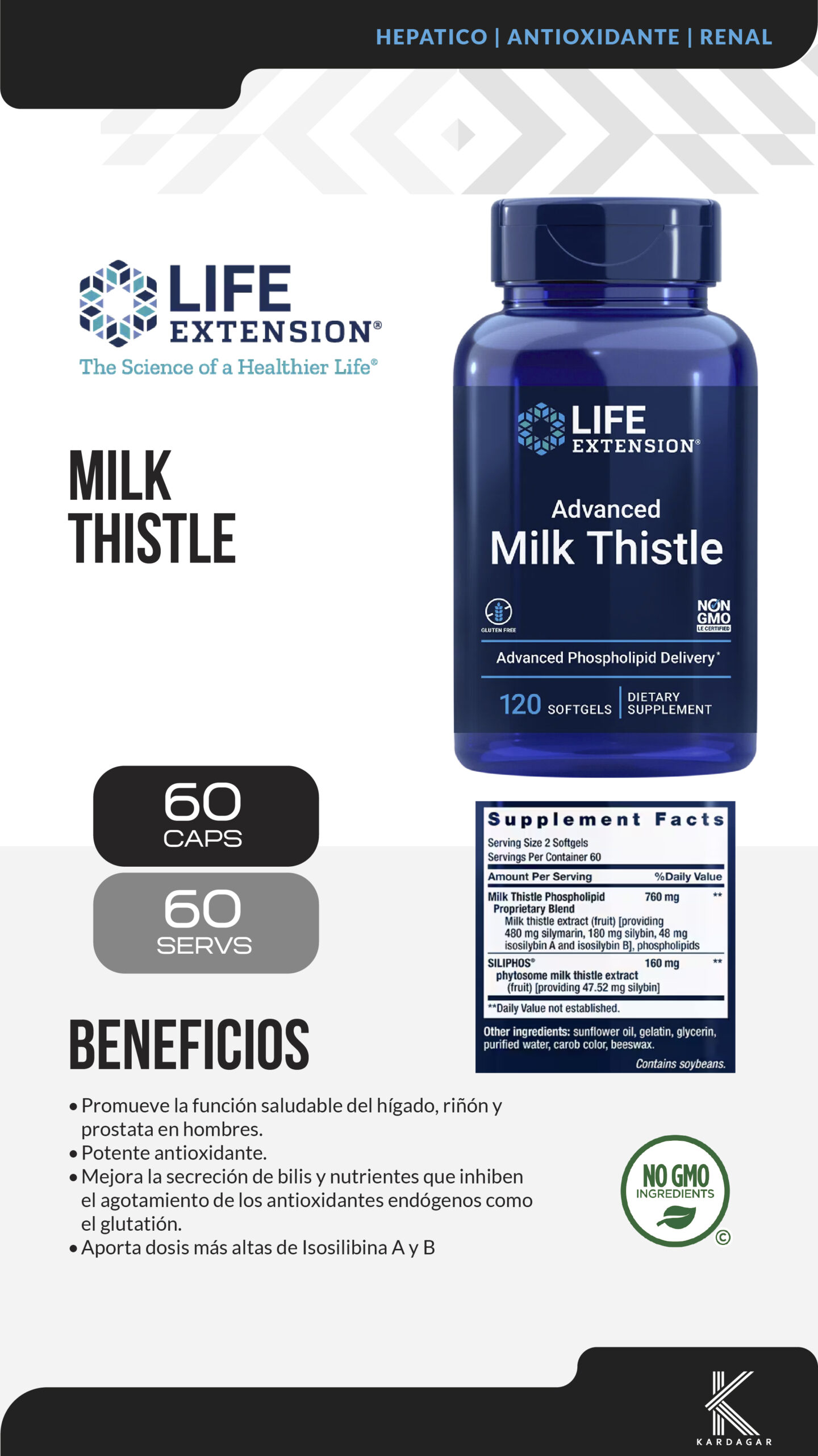 Esta fórmula proporciona los beneficios de la silimarina, las silibininas y las isosilibina A y B del cardo mariano, así como fosfolípidos para ayudar a la absorción. Estos compuestos brindan un refuerzo de espectro completo para la salud del hígado.